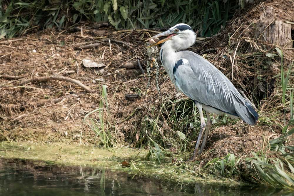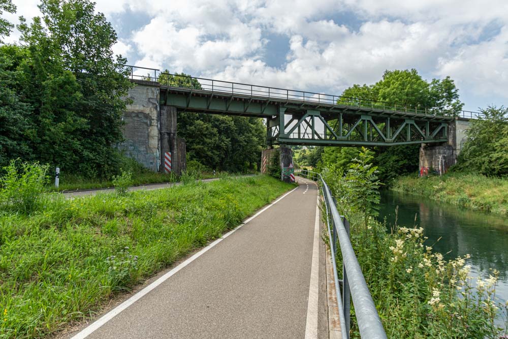 Nachdem die Autobahn A7 unterquert wurde, folgt der Radweg nun der Landstraße und wir erreichen bald Giengen an der Brenz. In diesem Bereich ist die Brenz relativ naturbelassen und man kann Glück haben auch Graureiher bei der Jagd nach Fischen oder Fröschen zu beobachten.
