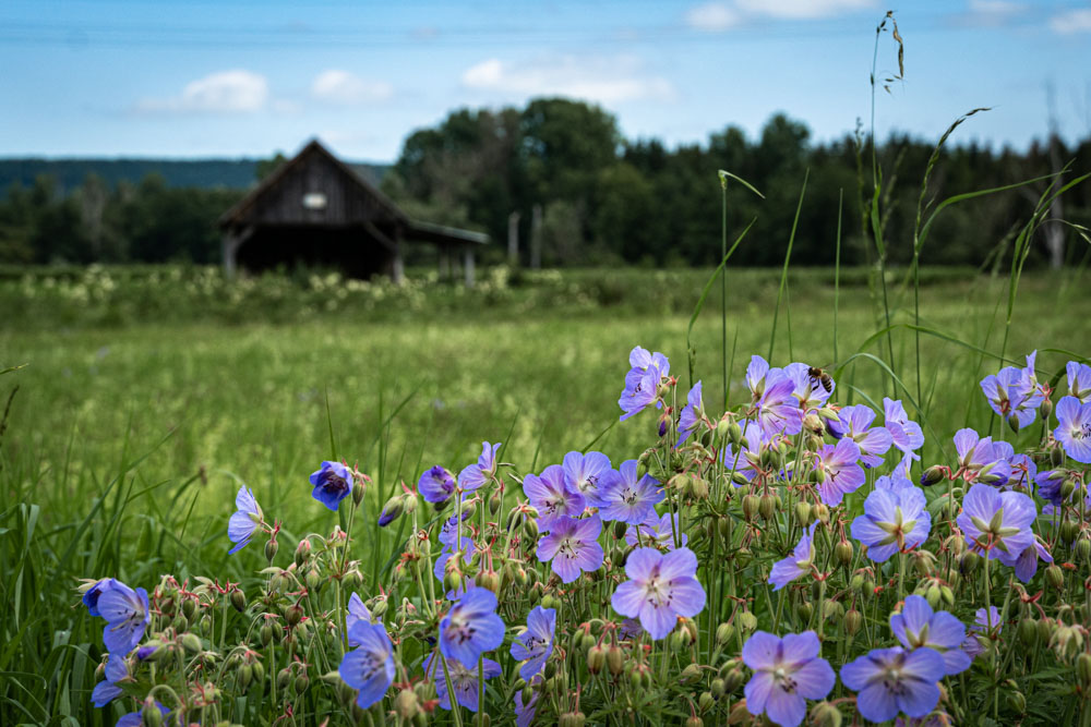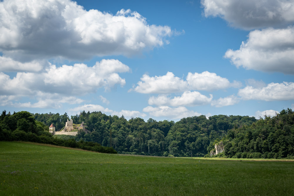 Bereits nach 400 m verlassen wir den markierten Radweg und folgen dem asphaltierten Weg nach rechts bergan. Nachdem wir die Steigung gemeistert haben, erreichen wir die Wiesen an der Hürbe und folgen dem Weg bis nach Burgberg (14 km). Wir folgen der Wasserstraße am westlichen Ortsrand von Burgberg. Rechterhand erstreckt sich in Hang mit Wacholderheide. Auf halber Strecke am Hang der Wacholderheide treffen wir an einer Einmündung wieder den Albtäler Radweg.