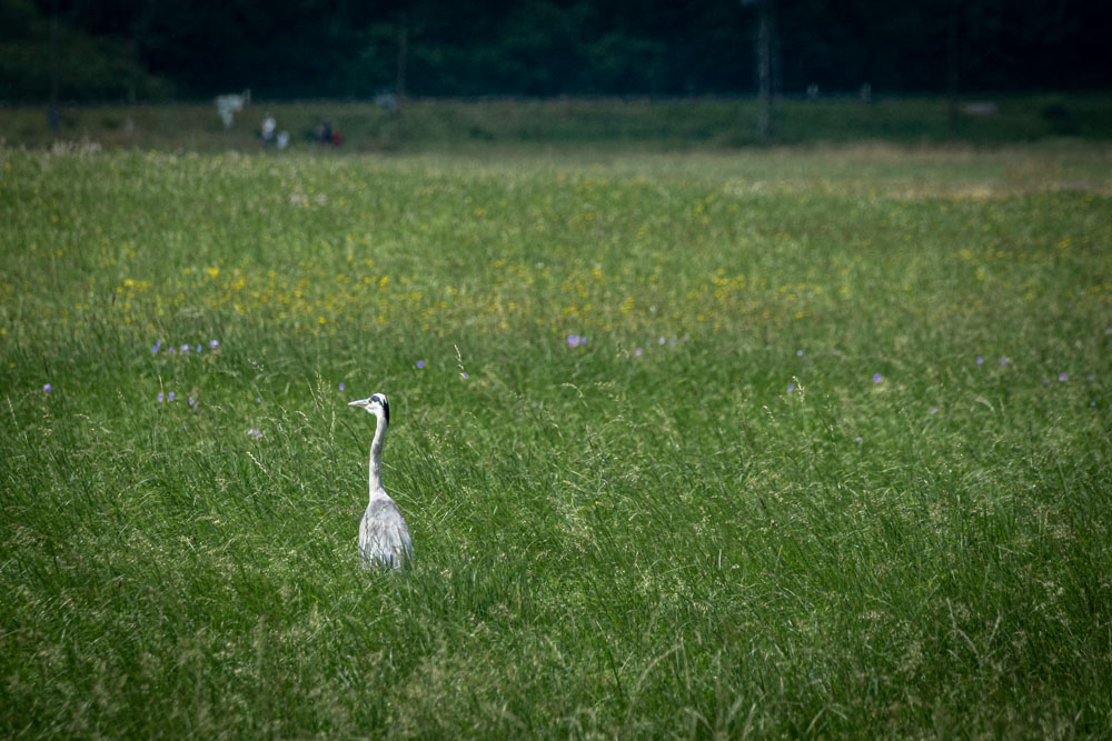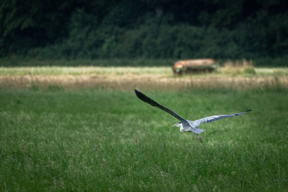 An der Einmündung folgen wir den Weg nach links über die weite Ebene. In der Ferne sehen wir die Ruine der Kaltenburg. Vorn links sehen wir den Kagstein. Diese feuchte Wiese bietet dem Graureiher und auch Störchen wieder reichlich Nahrung und die Wahrscheinlichkeit einige davon zu beobachten ist sehr hoch.