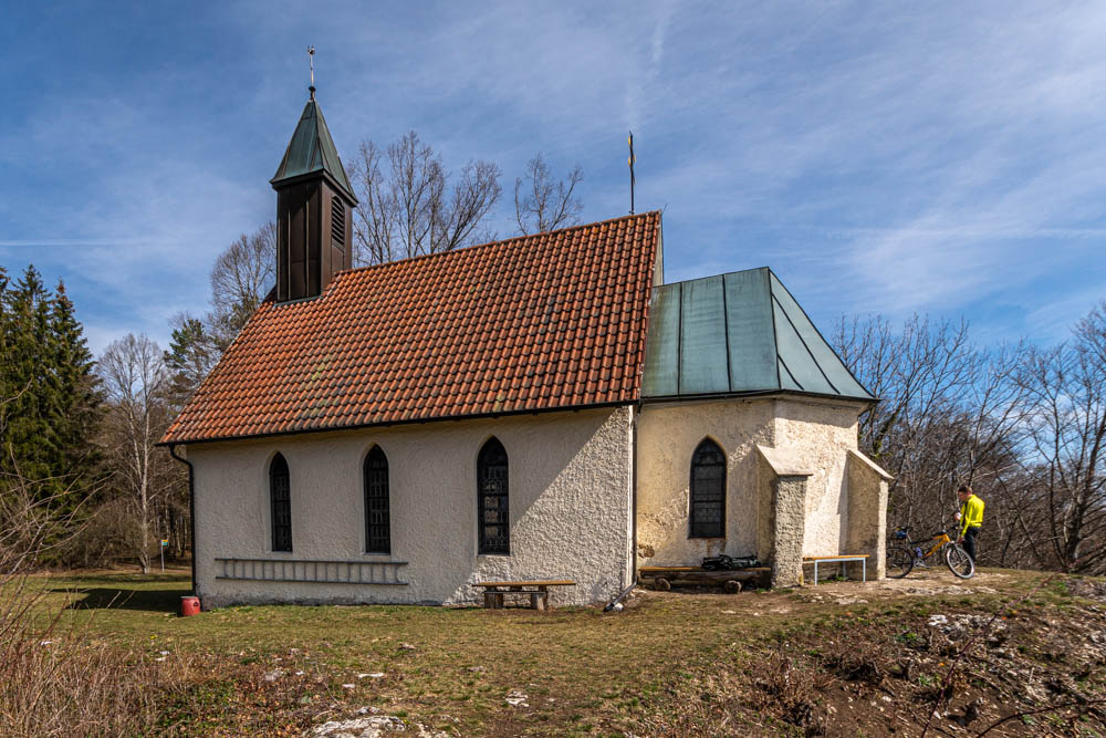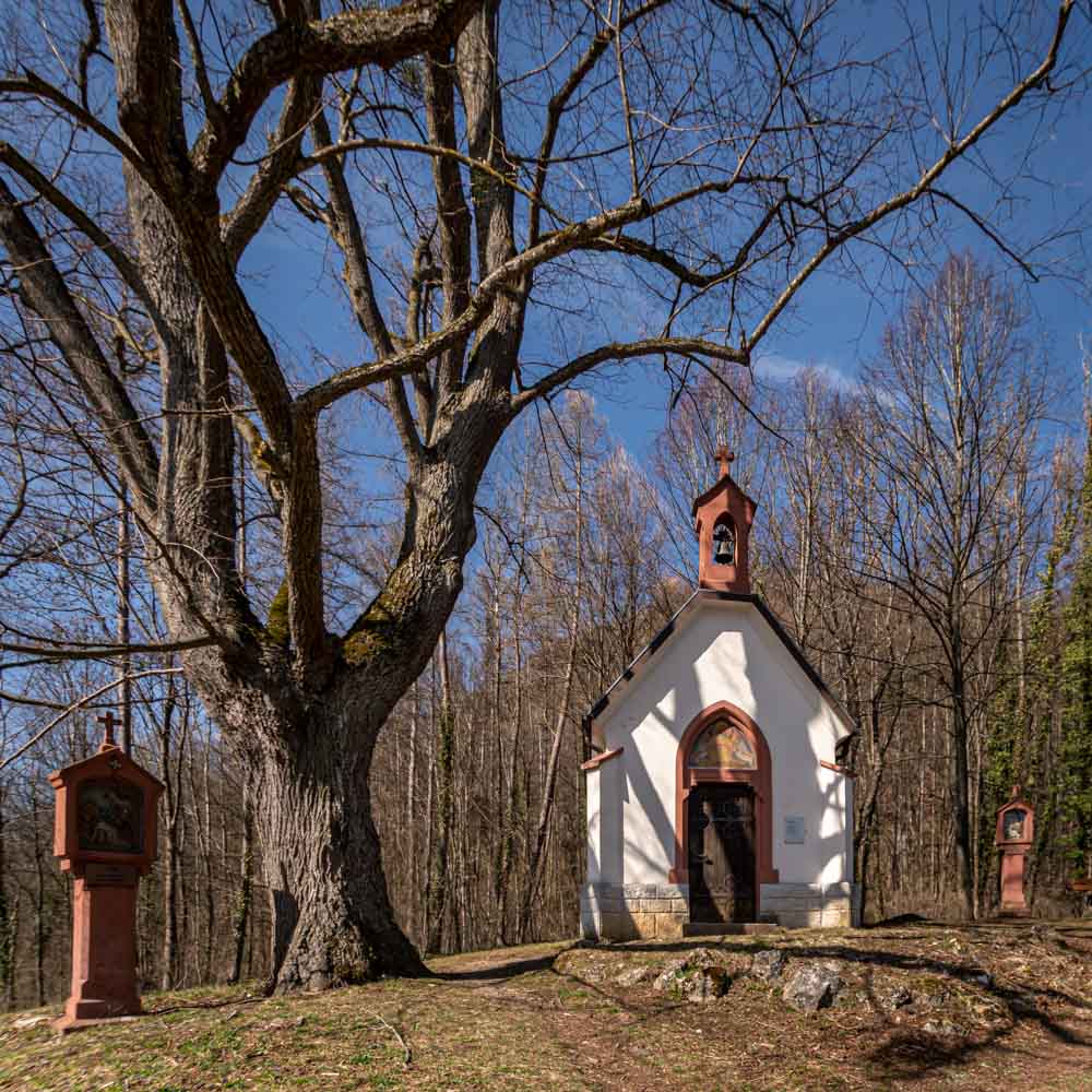 Nach weiteren ca. 1,1 km erreichen wir die Brunnenbühl-Kapelle oberhalb von Bad Ditzenbach. Diese winzige Kapelle wurde 1908 erbaut und ist ebenfalls Teil eines Kreuzweges von Bad Ditzenbach aus. Diese kleine Kapelle ist umgeben von einigen großen beeindruckenden Linden.