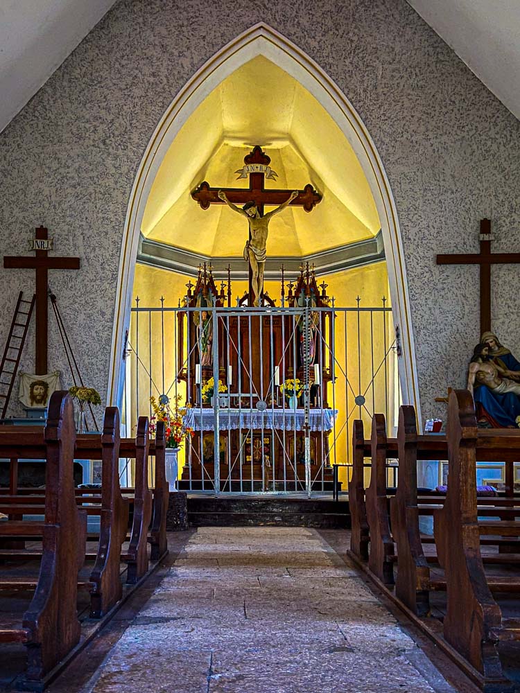 Nach ca. 2 km haben wir die Kreuzkapelle Gosbach erreicht. Die kleine 1882/83 gebaute Kapelle ist das Ziel des Kreuzweges von Gosbach aus. Im kleinen Innenraum sticht der schöne Altar heraus.