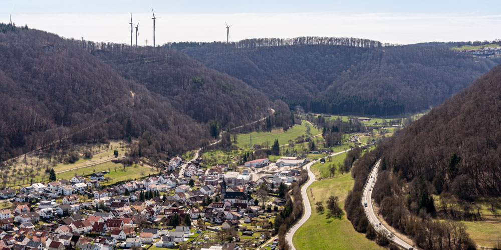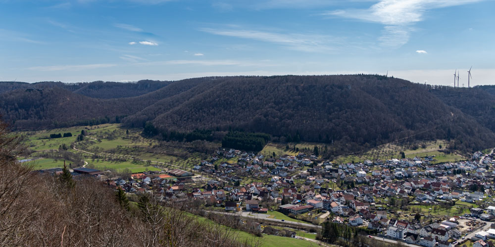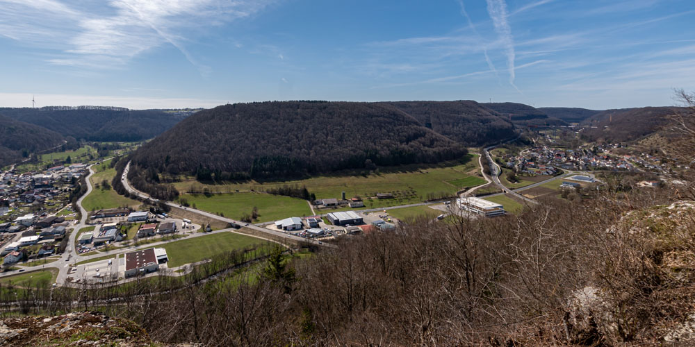 Vom Plateau vor der Kreuzkapelle aus hat man einen wunderschönen Blick ins obere Filstal. Richtung Osten sieht man Bad Ditzenbach. Direkt unterhalb der Kreuzkapelle liegt unser Ausgangspunkt Gosbach und Mühlhausen im Täle und Richtung Westen sieht man Gruibingen.