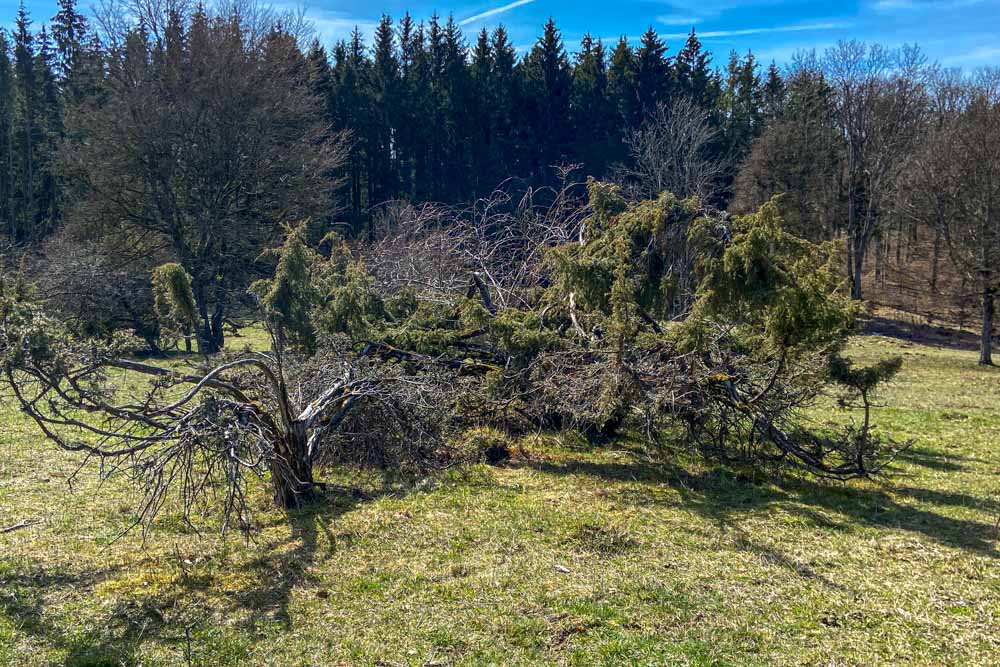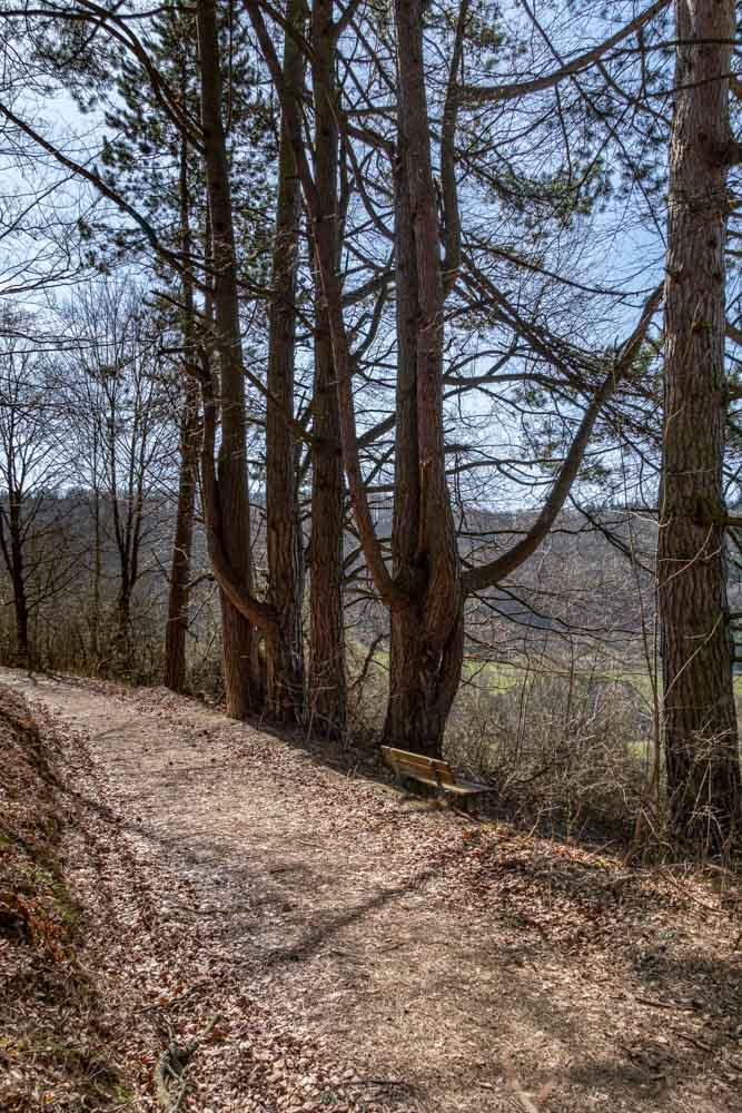 Wir verlassen das Plateau der Kreuzkapelle und folgen dem Ausschilderung des Jubiläumsweges oder des Schönbachweges. Nach ca. 600m erreichen wir den Abzweig nach recht zum Leimberg. Der Leimberg selbst ist eine vom Wald umgebene runde Bergkuppe. Der umliegende Wald lässt leider keine Ausblicke auf die Schwäbische Alb zu. Dafür sind einige interessant aussehende Gewächse zu bestaunen. Wir kehren den selben Weg wieder bis zum Abzweig zurück.