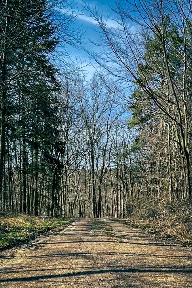 Nach ca. 700 biegt der Radweg an eine Gabelung nach rechts ab. Wir folgen jedoch dem Weg nach links in Richtung Wald. Hier folgen wird dem Waldweg unterhalb des Galgenbergs weiter Richtung Bad Ditzenbach. Dieser Weg ist gleichzeitig auch Teil eines ausgeschilderten Netzes an Lauf- und Joggingwegen.