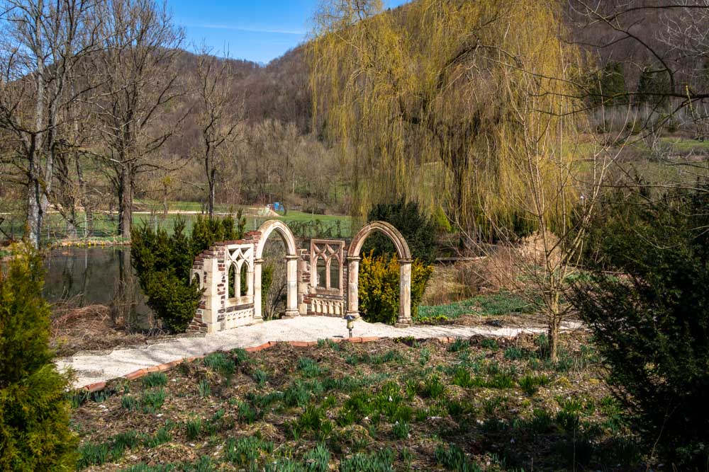 200 m nachdem wir den Wald verlassen haben, kommen wir an der Blumenmühle vorbei. Die ehemalige Hardtmühle wurde von den Blumenmönchen der Bruderschaft Kecharismai im Jahr 2000 übernommen und zu einem Schulungszentrum mit angeschlossenem Ferienhaus um.